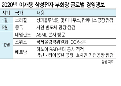 지난해 9차례 해외 출장길에 올랐던 이 부회장은 올해 코로나19 여파로 글로벌 경영 행보를 잠시 미뤄왔다. 지난 1월 설 연휴 기간 브라질 상파울루 법인 등을 찾은 데 이어 5월 중국 시안 반도체 공장을 점검한 이 부회장은 5개월 동안 발이 묶인 채 국내에 머물렀다.