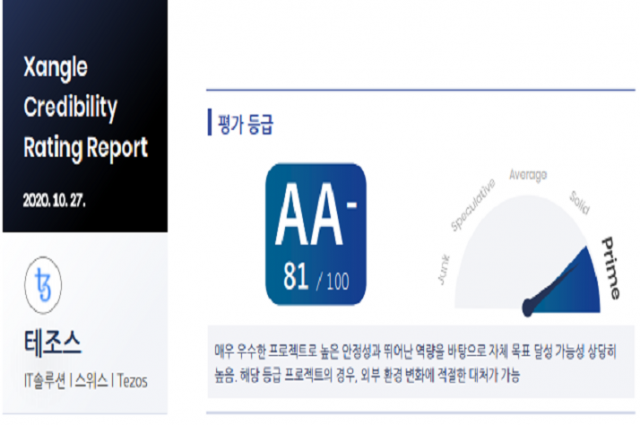 28일 쟁글은 테조스 신용등급 평가를 실시한 결과 6개 항목에서 모두 하이(High)를 받았다고 밝혔다. 테조스의 최종 평가 등급은 ‘에이에이 마이너(AA-)‘다. 총 18개 등급 중 상위 4등급에 속한다. 점수로는 81점이다. 쟁글 신용도평가 중 80점 이상을 받은 프로젝트는 테조스가 처음이다.