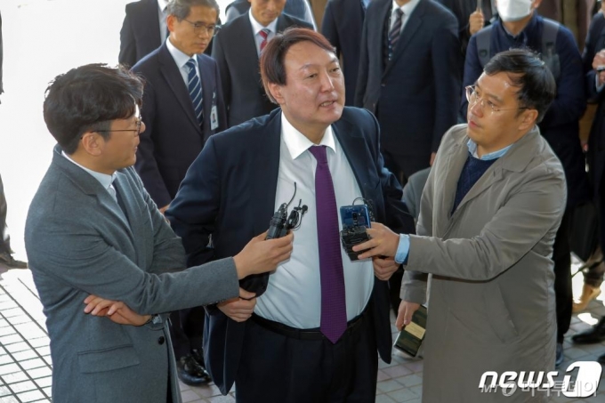 윤석열 검찰총장이 지난 2월20일 오후 광주 동구 산수동 광주지방·고등검찰청을 찾아 청사에 들어서기 앞서 취재진의 질문에 답하고 있다./사진=뉴스1 |
