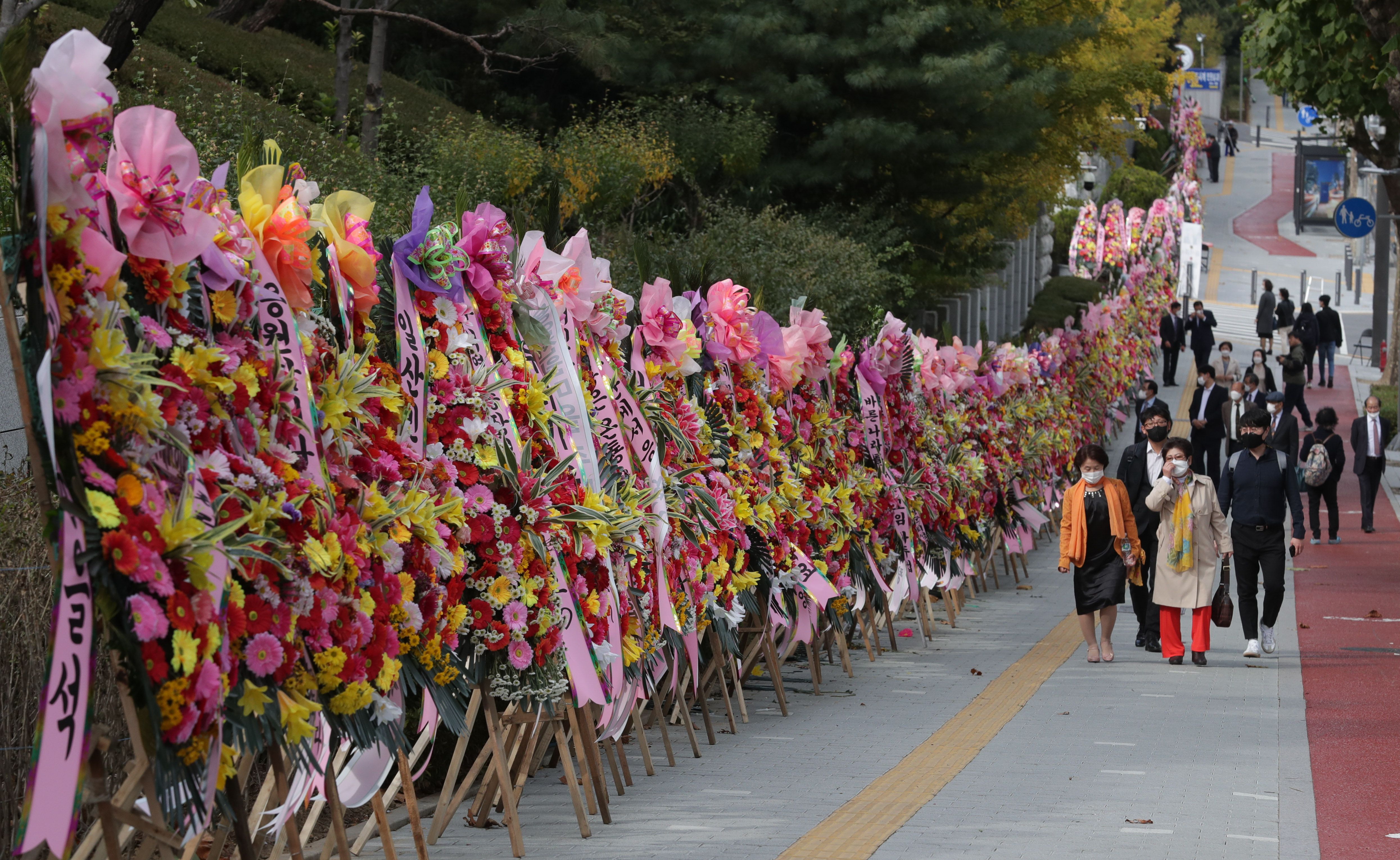 앞서 윤 총장이 지난 22일 국회 법제사법위원회 국정감사에 출석한 이후 대검 앞에는 윤 총장을 응원하는 글귀가 적힌 화환이 놓이기 시작했다. 화환에는 ‘윤석열이 반드시 이긴다’ ‘힘내라 윤석열’ 등 문구가 적혔다.