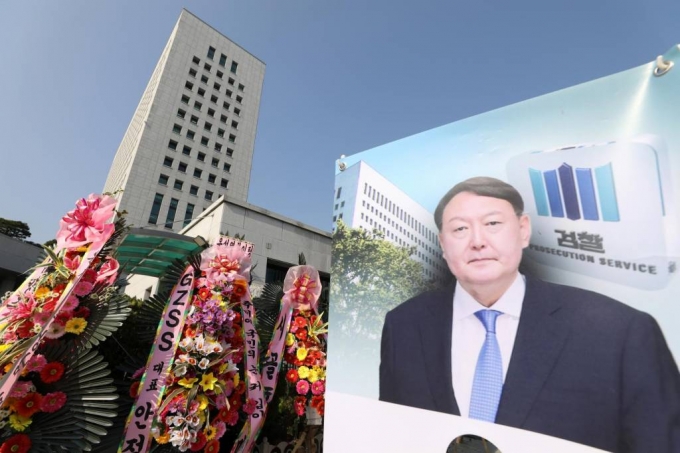 26일 서울 서초구 대검찰청 앞에 윤석열 검찰총장을 응원하는 화환들과 현수막이 놓여 있다. / 사진=뉴시스 |