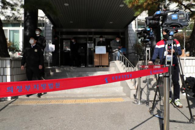 29일 경기 의정부시 의정부지방법원 1호법정 출입구 앞에 포토라인이 설치돼 있다. 이날 윤석열 검찰총장의 장모 최 모씨는 법정에 나오지 않았다. 뉴스1 |