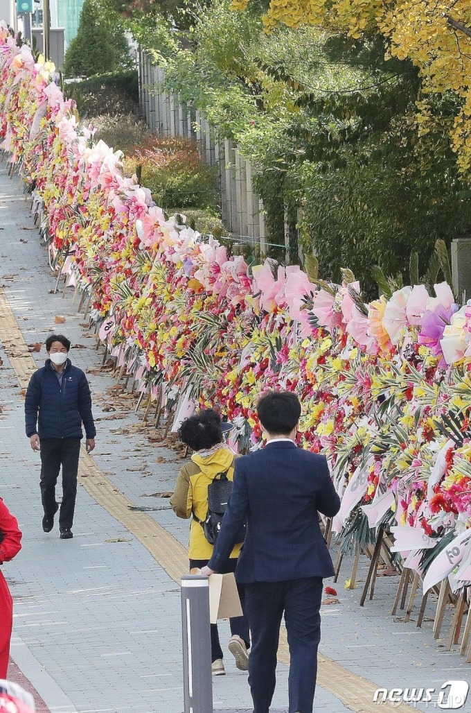 추미애 법무부 장관이 윤석열 검찰총장을 겨냥해 ‘옵티머스 사건’ 일부를 지난해 검찰이 무혐의 처리했던 것에 관한 감찰을 지시한 가운데 지난 28일 오후 서울 서초구 대검찰청 앞 거리에 윤 총장 지지자들이 보낸 화환이 늘어서 있다. /사진=뉴스1윤석열 검찰총장을 응원하는 내용으로 대검찰청 정문 앞에 설치된 이 화환들은 300개를 넘겼다. 화환 행렬은 대검 정문에서 좌우로 대법원과 서울 서초경찰서 경계까지 갔고, 공간이 없어 맞은편 서울중앙지검 앞으로 넘어갔다. 서초구는 보수단체 ‘애국순찰팀’과 ‘자유연대’ 앞으로 행정대집행 계고서를 보내 “28일까지 자진 철거가 되지 않을 경우 대검 정문 좌우에 놓인 화환들을 강제로 철거하겠다”고 밝혔다. 2020.10.28/뉴스1 |