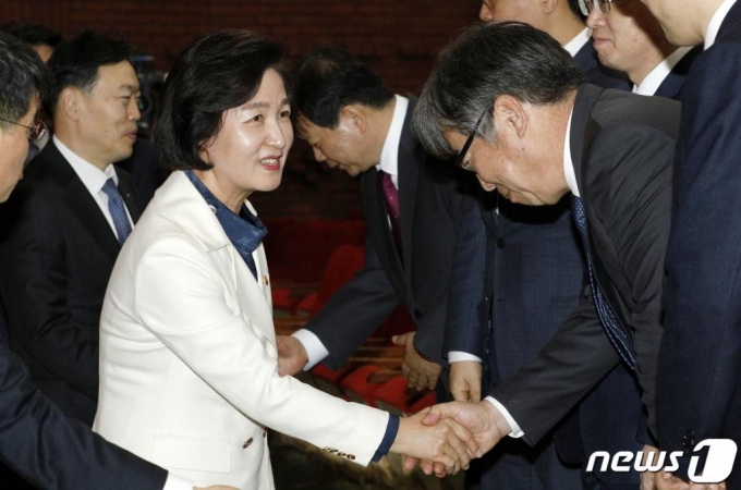 추미애 법무부 장관이 지난 2월 3일 오후 경기 정부과천청사 법무부에서 신임검사 임관식을 마친 후 윤대진 사법연수원 부원장과 악수하고 있다. / 사진제공=뉴스1 |