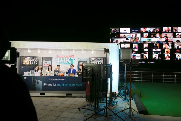 KT는 29일 밤 11시에 ‘비대면 라이브 전야제’를 열었다. 이번 출시행사는 IT 전문 BJ ‘가전주부’와 MC 박권이 진행을 맡아 아이폰12 시리즈와 KT 서비스에 대한 설명과 함께 다양한 시청자 퀴즈를 열었다. 스페셜 게스트로는 프로야구 KT 위즈 김주일 응원단장과 정유민 치어리더, 김한슬 치어리더 등이 참여했다.
