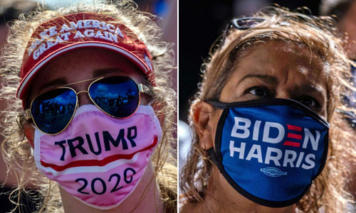 미국 대선 최대 격전지인 플로리다주 탬파에서 29일(현지시간) 도널드 트럼프 대통령과 조 바이든 민주당 대선후보가 동시에 유세를 펼치며 맞붙은 가운데 트럼프 대통령 지지자(왼쪽)와 바이든 후보 지지자(오른쪽)가 각기 지지 후보 이름이 새겨진 마스크를 쓰고 연설을 듣고 있다. 탬파=AFP연합뉴스 |