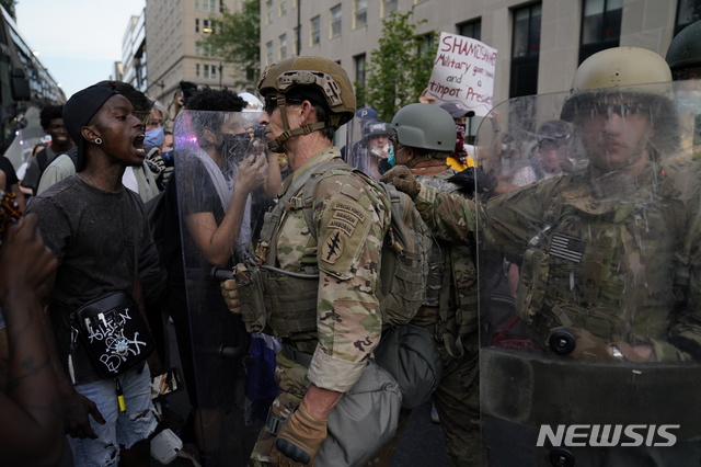 [워싱턴=AP/뉴시스]지난 6월3일(현지시간) 미국 워싱턴 백악관 근처에서 조지 플로이드 사망에 항의하는 시위대가 유타주방위군과 대치하고 있다. 2020.10.31 |