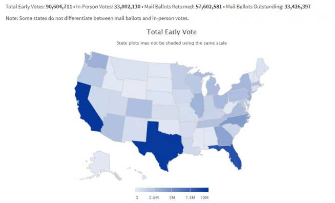 선거 정보를 제공하는 ‘미국선거프로젝트(The US Elections Project)’도 이날 기준 사전 투표 참여자 수가 9060만4711명이라고 밝혔다. 이 중 직접 우편 투표 방식으로 사전 투표를 완료한 유권자 수는 5760만 명, 우편 투표를 신청했지만 아직 완료하지 않은 유권자 수는 3342만 명으로 각각 집계됐다. 사전 투표자 수가 가장 많은 주는 캘리포니아와 텍사스, 플로리다 순이다.