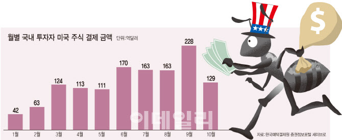 1일 한국예탁결제원 증권정보포털 세이브로(SEIBro)에 따르면 10월 국내투자자들이 미국 증시에서 매수, 매도한 금액을 합친 결제대금은 약 129억달러으로 집계됐다. 이는 전달 228억달러에 비해 약 43% 감소한 액수다. 지난 1월 42억달러에서 6월 170억달러으로 꾸준히 증가하다 7월 163억달러으로 한 번 감소한 적이 있으나 감소 폭 자체가 큰 건 이번이 처음이다.