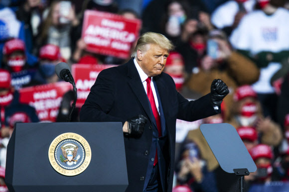 도널드 트럼프 미국 대통령이 31일(현지시간) 펜실베이니아주 몽투르빌에서 열린 유세에서 지지자들을 향해 검은 장갑을 낀 손으로 주먹을 쥐어 보이고 있다. 몽투르빌 게티/AFP 연합뉴스 |
