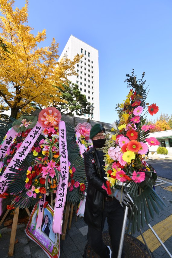 윤석열 검찰총장을 지지하는 보수성향의 시민단체 자유연대 회원들이 2일 오전 서울 서초구 대검찰청 청사 앞 화환을 자진 철거하고 있다. 사진=서동일 기자 |