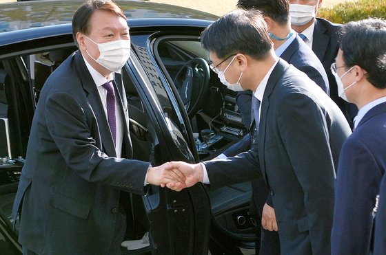윤석열 검찰총장이 지난달 29일 오후 대전고검 정문에 도착, 마중나온 강남일 대전고검장, 이두봉 대전지검장과 차례로 반갑게 악수하고 있다. [사진 프리랜서 김성태] |