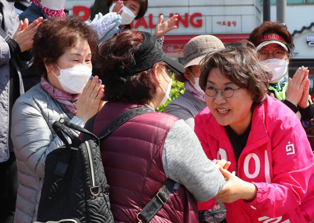 제21대 총선 서울 동대문을에 출마한 이혜훈 미래통합당(현 국민의힘) 후보가 4월 14일 동대문구 장안빌딩 앞에서 열린 거리유세에서 시민들과 인사를 하고 있다.뉴시스 |