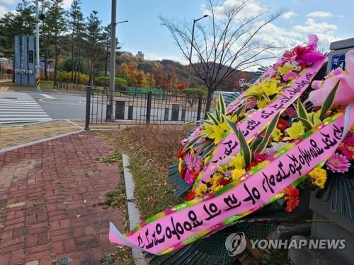 이날 오전 10시께 '윤석열(포청천) 밴드 회원 일동' 명의의 화환이 법무연수원 진입로 초입에 세워지기도 했다.
