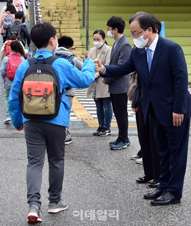 2일 오전 금정구 동현초등학교에서 김석준 부산교육감과 교사 등이 등교하는 학생들과 인사하고 있다.(사진=뉴시스) |