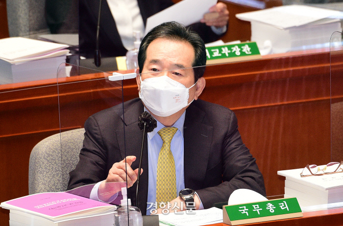 정세균 국무총리가 4일 국회에서 열린 예산결산특별위원회 전체회의에서 의원들의 질의에 답변하고 있다. /김영민 기자 |