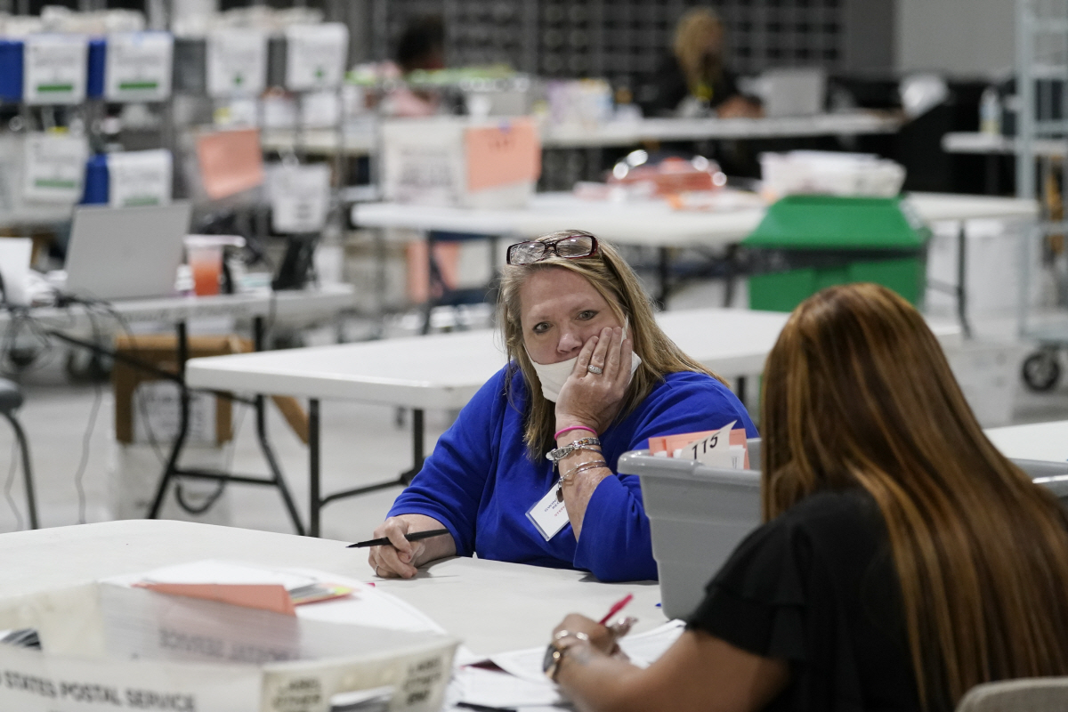 미국 조지아주 그위넷카운티의 선거관리본부에서 6일(현지시간) 부재자 투표와 사전투표 용지가 도착하기를 기다리고 있다. 그위넷/AP연합뉴스 |