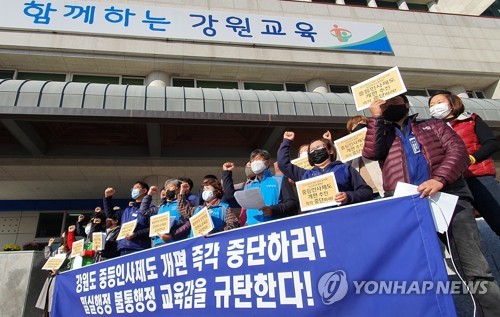 (춘천=연합뉴스) 양지웅 기자 = 전국교직원노동조합 강원지부(강원 전교조)가 도교육청이 추진하는 중등교사 인사제도 개편이 작은 학교 황폐화를 초래한다고 비판하며 이를 중단할 것을 촉구했다.