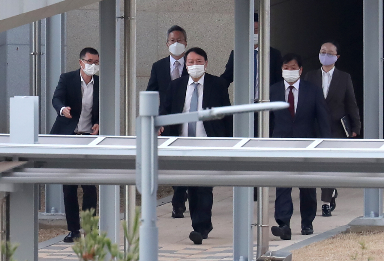 윤석열 검찰총장이 9일 오후 진천 법무연수원에서 신임 차장검사를 대상으로 강연을 하기 위해 연수원 내에서 이동하고 있다. 오른쪽 두 번째부터 배성범 법무연수원장, 윤 총장, 이문한 법무연수원 기획부장 직무대리. [연합] |