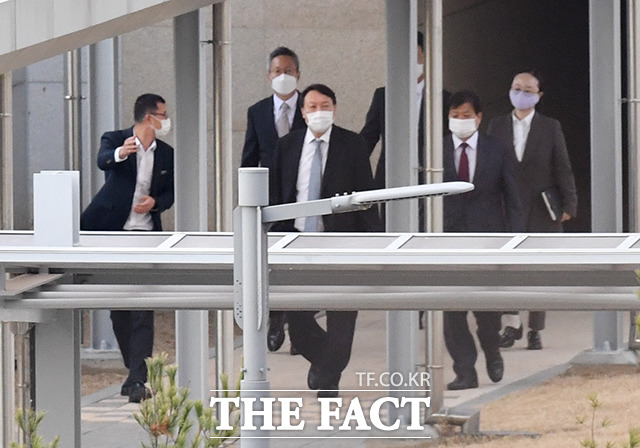 윤석열 검찰총장(가운데)이 9일 오후 충북 진천군 법무연수원에서 신임 차장검사를 대상으로 강연을 하기 위해 연수원 내에서 이동하고 있다. / 진천=배정한 기자 |
