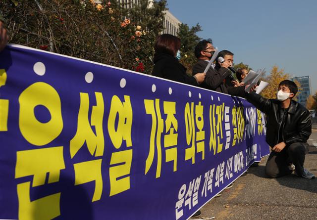 12일 서울 서초구 서울중앙지검 앞에서 윤석열 검찰총장 가족 의혹 관련 수사를 촉구하는 내용의 기자회견이 열리고 있다. 연합뉴스 |