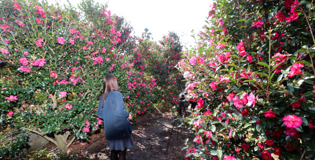 12일 오후 제주 서귀포시 남원읍 휴애리 자연생활공원에 동백꽃이 활짝 피어 오가는 이들의 눈길을 사로잡고 있다.(사진=연합뉴스) |