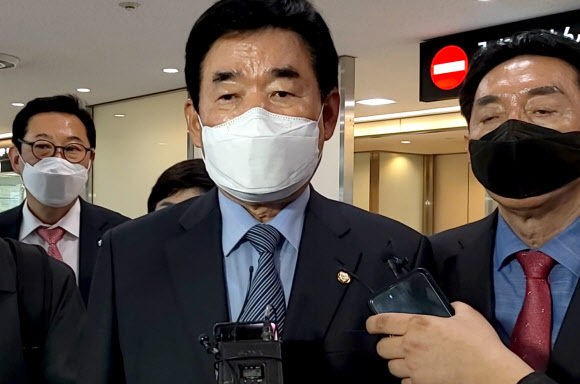 한일의원연맹 회장인 더불어민주당 김진표 의원 등 여야 국회의원 7명이 12일 일본 나리타공항에 도착해 인터뷰하고 있다. 연합뉴스 |