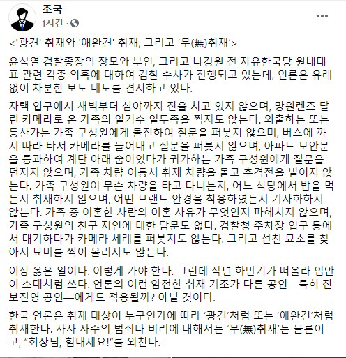 이에 조 전 장관은 "한국 언론은 취재대상이 누구인가에 따라 '광견' 또는 '애완견'처럼 취재한다"며 "자사 사주의 범죄나 비리에 대해서는 '무취재'는 물론이고, '회장님 힘내세요!'를 외친다"고 힐난했다.