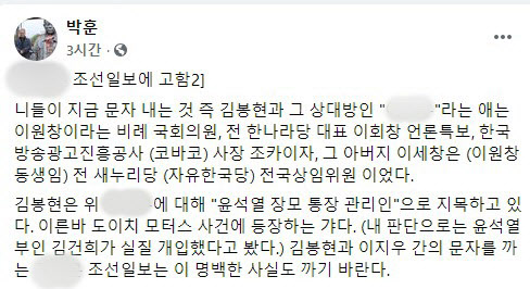 박 변호사는 “니들이 지금 문자 내는 것, 즉 김봉현과 그 상대방인 A(본 포스트에는 실명 공개)라는 애는 이원창이라는 비례 국회의원, 전 한나라당 대표 이회창 언론특보, 한국방송광고진흥공사 사장 조카이자, 그 아버지 이세창은 전 새누리당 전국상임위원이었다”고 주장했다.