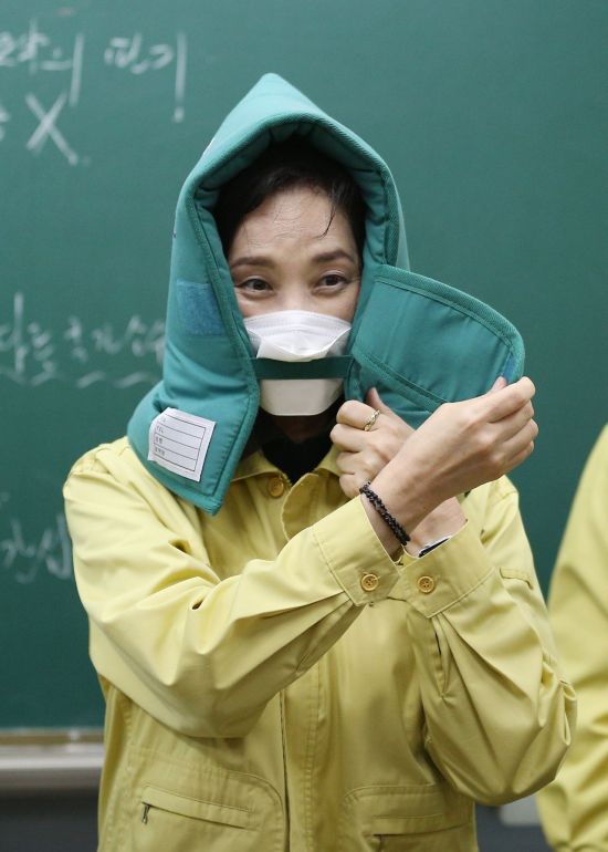 유은혜 부총리 겸 교육부 장관이 19일 대학수학능력시험(수능) 준비 상황을 점검하기 위해 경북 경주시 경주여자고등학교를 방문, 2학년 교실을 찾아 지진 발생 때 머리 보호를 위한 방재 두건을 착용해보고 있다. [이미지출처=연합뉴스] |