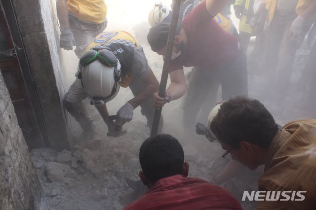 [알레포=AP/뉴시스]지난 10월6일(현지시간) 시리아 알레포 인근 알-바브의 버스 정류소 인근에서 폭발물을 실은 트럭이 폭발해 하얀 헬멧 대원들이 피해자들을 구조하기 위해 무너진 주변 건물을 파내고 있다. 시리아 야당 활동가들은 터키의 지원을 받는 반군이 통제하는 이 마을에서 발생한 이번 테러로 최소 19명이 숨지고 80명 이상이 다쳤다고 밝혔다. 2020.11.19 |