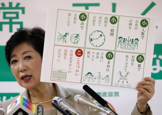 고이케 유리코 도쿄도지사가 19일 기자회견에서 코로나19 대응 수칙을 설명하고 있다. 소수의 사람이,짧은 시간 동안 모여, 작은 소리고 이야기하며, 작은 접시에 덜어먹자는 개인적 방역 대책이다. 로이터=연합뉴스 |