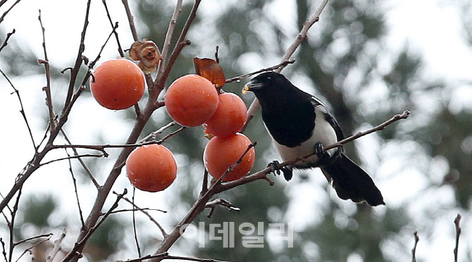 가을비가 내린 18일 서울 서초동 서울중앙지법에서 까치 한 마리가 잘익은 감을 쪼아먹고 있다.(사진=방인권 기자) |