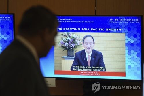 (쿠알라룸푸르 AP=연합뉴스) 스가 요시히데(菅義偉) 일본 총리가 세계 각국 최고경영자(CEO)에게 보내는 영상 메시지가 20일 스크린에 재생되고 있다. [말레이시아 정부 제공, 재판매 및 DB 금지] |