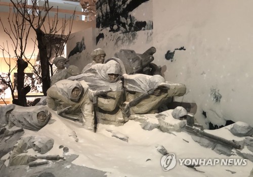 (베이징=연합뉴스) 김윤구 특파원 = 10월 25일 베이징 군사박물관에서 개막한 '항미원조전쟁' 70주년 기념전에서 한국전쟁의 장진호 전투가 묘사돼 있다. 2020.10.25 ykim@yna.co.kr |
