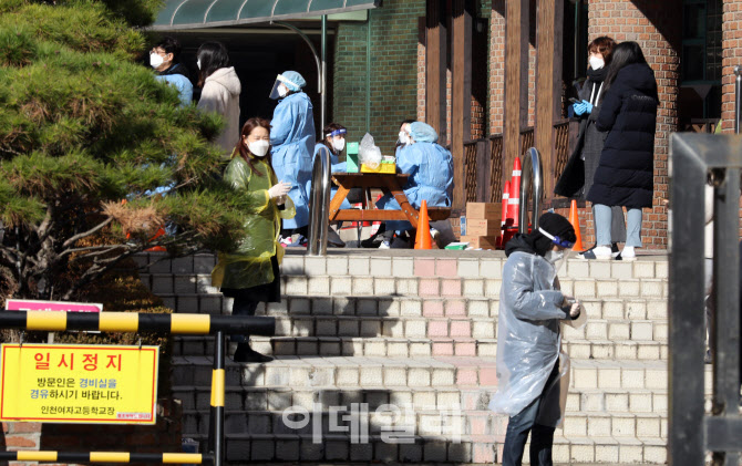 수도권 사회적 거리두기 2단계 격상에 따라 고교 2/3 등교를 하루 앞둔 23일 인천시 연수구 모 여고 교사가 신종 코로나 바이러스 감염증(코로나19) 확진 판정된 가운데 학생들이 학교에 설치된 선별진료소에서 검사를 받고 있다.(사진=뉴시스) |