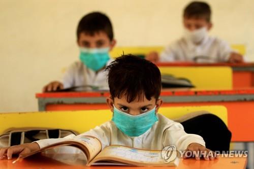 파키스탄 페샤와르의 한 학교에서 마스크를 쓴 채 수업에 참여한 학생들. [EPA=연합뉴스] |