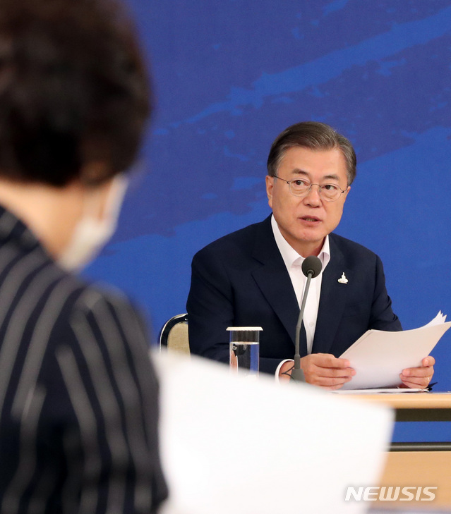 [서울=뉴시스]추상철 기자 = 문재인 대통령이 21일 오후 청와대 영빈관에서 열린 제2차 국정원·검찰·경찰 개혁 전략회의에서 추미애 법무부 장관을 바라보며 발언하고 있다. 2020.09.21. scchoo@newsis.com |