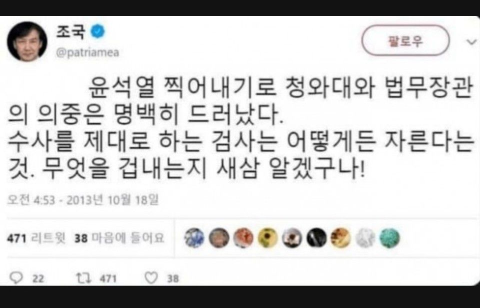 조 전 장관은 지난 2013년 10월 18일 트위터에 “윤석열 찍어내기로 청와대와 법무장관의 의중은 명백히 드러났다”며 “수사를 제대로 하는 검사는 어떻게든 자른다는 것. 무엇을 겁내는지 새삼 알겠구나!”라는 글을 남겼다.