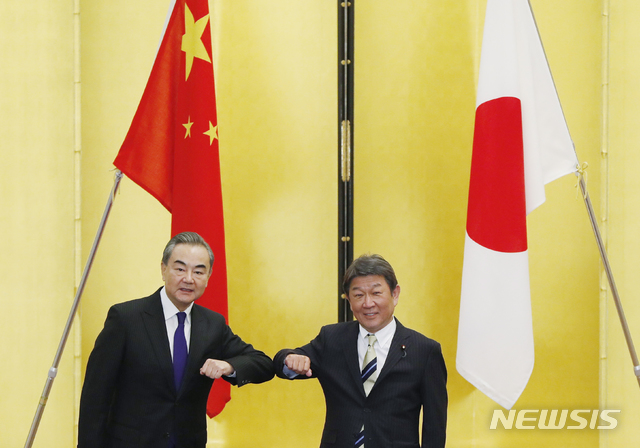 [도쿄=AP/뉴시스]왕이(왼쪽) 중국 외교부장이 24일 일본 도쿄에서 모테기 도시미쓰 일본 외무상과 만나 팔꿈치 인사를 하고 있다. 왕이 부장은 모테기 장관과 만나 중일 관계의 안정적 구축과 코로나19로 피해를 본 경제를 되살리는 방안 등을 논의한 것으로 알려졌다. 2020.11.24. |
