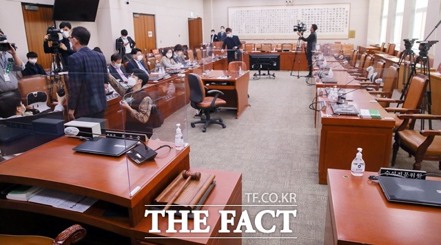 [더팩트|문혜현 기자] 야당이 요청한 국회 법제사법위원회 전체회의가 시작된 지 15분만에 파행됐다. 야당이 윤석열 검찰총장의 출석을 요구한 가운데 더불어민주당 소속 윤호중 법사위원장은 "위원회에서 출석을 요구한 적도 없고, 여야 간 합의되지 않았다"며 산회를 선포했다.