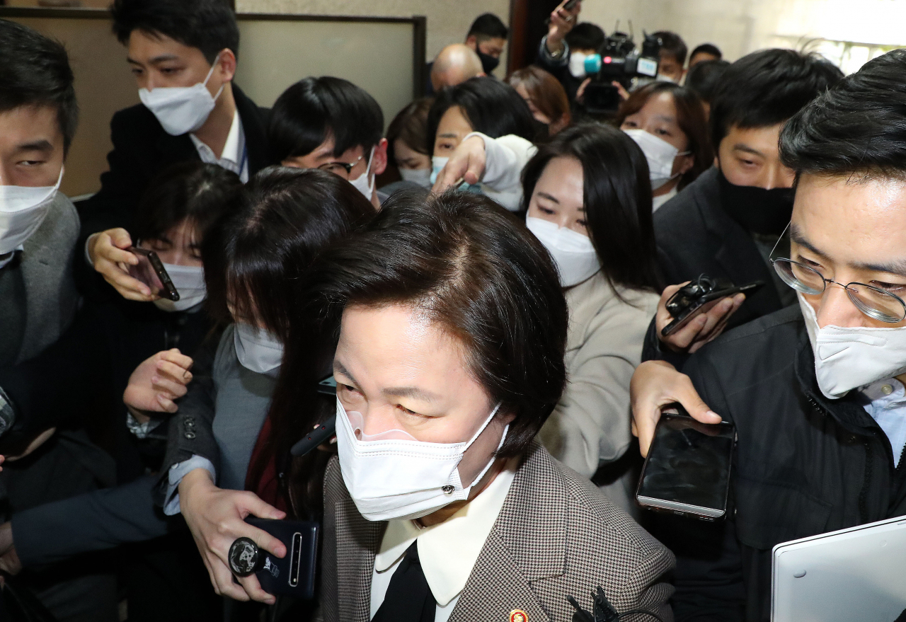추미애 법무부 장관이 25일 국회에서 열린 고위공직자범죄수사처장 후보자 추천위원회 전체회의에 참석하며 기자들의 질문을 받고 있다. 이상섭 기자 babtong@heraldcorp.com |