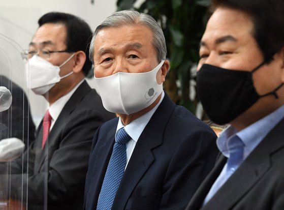 국민의힘 김종인(가운데) 비대위원장은 25일 오후 국회에서 긴급 기자회견을 갖고 윤석열 검찰총장에 대한 직무정지에 관해 발언하고 있다. 오종택 기자 |