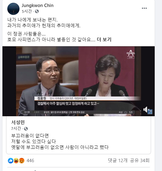 이날 진 전 교수는 2013년 11월 19일 당시 추 의원이 대정부질문에서 정홍원 총리에게 질타하는 영상을 공유하면서 “내가 나에게 보내는 편지. 과거의 추미애가 현재의 추미애에게”라고 말했다.