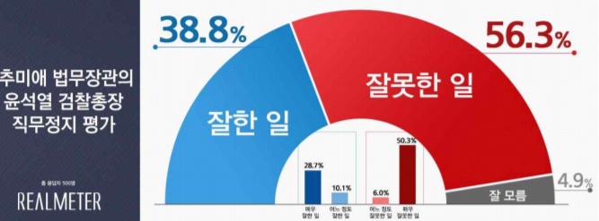 여론조사업체 리얼미터가 TBS 의뢰로 이달 25일 전국 18세 이상 500명에게 ‘추미애 장관의 윤석열 총장 직무정지 조치에 대해 어떻게 생각하는가’를 물은 결과 ‘잘못한 일’이라는 응답이 56.3%로 집계됐다.