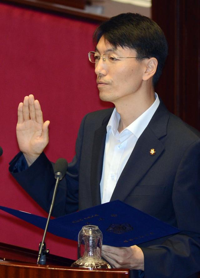 2012년 7월 11일 새누리당 정두언, 무소속 박주선 의원 체포동의안을 위한 국회 본회의에서 서기호 전 통합진보당 의원이 선서하고 있다. 한국일보 자료사진 |