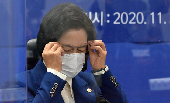 추미애 법무부 장관이 26일 국회에서 열린 '친인권적 보안처분제도 및 의무이행소송 도입 당정협의'에 참석, 안경을 쓰고 있다. 오종택 기자 |