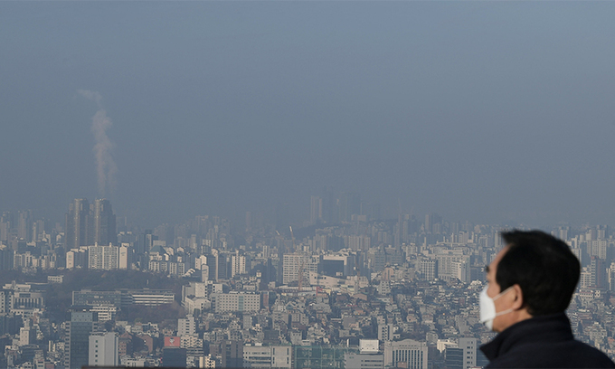 서울과 경기 등 수도권 일부 지역 미세먼지 농도가 ‘나쁨’ 수준을 보인 26일 서울 남산에서 바라본 도심이 뿌옇다.