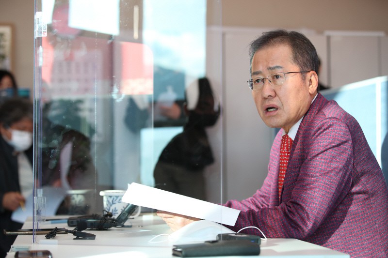 홍준표 무소속 의원(대구 수성구을)이 지난 20일 오후 대구 수성구에 있는 자신의 지역구사무실에서 긴급 기자간담회를 하고 있다. [사진 출처 = 연합 뉴스] |