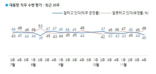 갤럽이 지난 24~26일 전국 만 18세 이상 1005명을 대상으로 조사한 결과, '잘하고 있다'는 긍정 평가는 40%로 지난 주에 비해 4% 하락한 것으로 나타났다. 반면 '잘못하고 있다'는 부정 평가는 같은 기간 3%포인트 상승한 48%로 집계됐다. 긍·부정 평가의 격차는 8%포인트로 지난 주에 비해 크게 벌어졌다. 나머지는 의견을 유보했다(어느 쪽도 아님 5%, 모름/응답거절 7%).